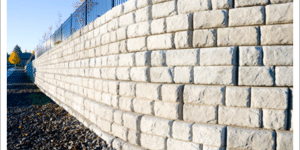 While retaining walls can be built of many different materials, the wall built of concrete and stone is a beautiful choice. A retaining wall built of masonry must have a quality drainage system for the soil that it supports. The masonry wall will need to have weeping holes installed to allow sufficient drainage and to relieve the soil pressures. The masonry wall sits on a concrete footing, which has been reinforced with rebar, below the frost line.