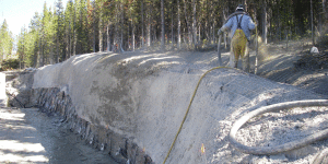 Shotcrete is incredibly effective in soil stabilization because it’s versatile, durable, and has a terrific ability to adhere strongly to the substrate. And because it gets applied pneumatically, it’s applied quickly and efficiently. And structurally it’s strong: it’s both a protective coating but also strong enough to anchor bolts and other types of anchors and support systems. On certain slopes that have poor substrate or steep gradients extra stabilization is added to ensure strength.
